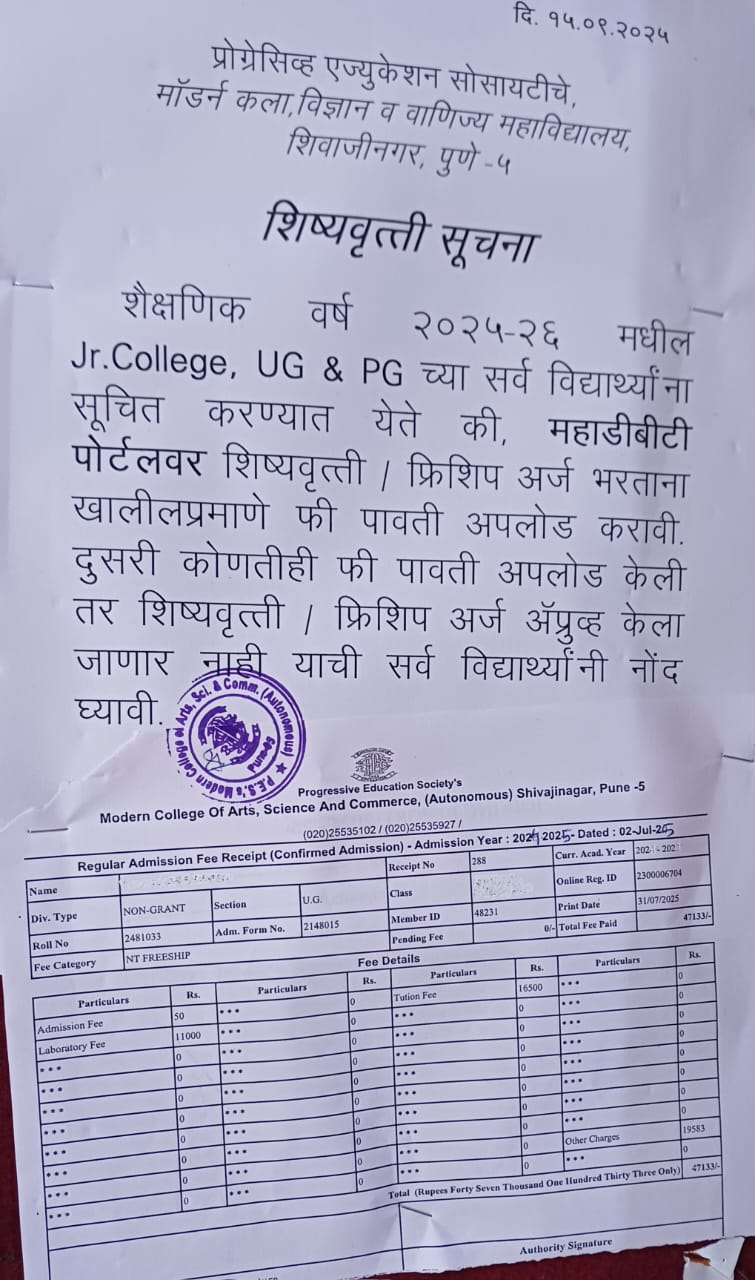 - Scholarship Notice regarding Fee Receipt required for filling Scholarship / Freeship Application in MAHADBT Portal for Junior College, UG and PG